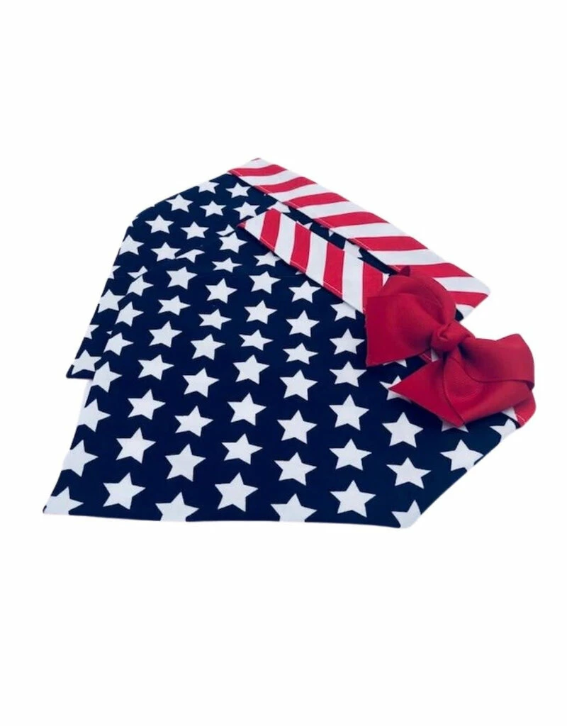 Handmade in the USA by Chloe & Max, this American Flag Bandana Dog Collar features white stars on blue, with red and white stripes trim and backing. These gorgeous buckle bandana collars come in 5 sizes XS-XL and snap on easily.