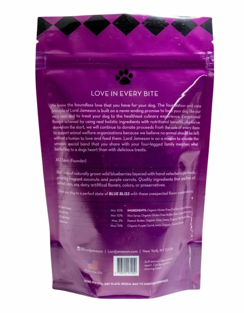 Crafted with a perfect blend of naturally grown wild organic blueberries layered with hand-selected superfoods, including fragrant coconuts and organic gluten-free oats to create a unique dog treat loved by all dogs.Â