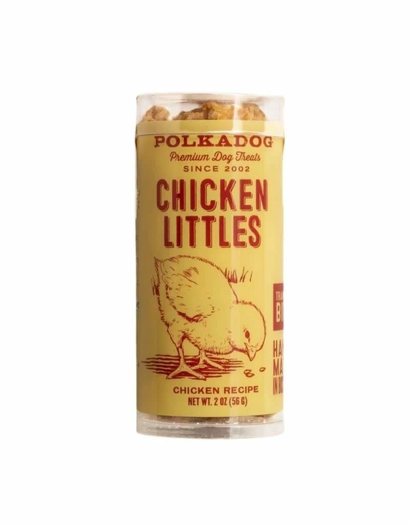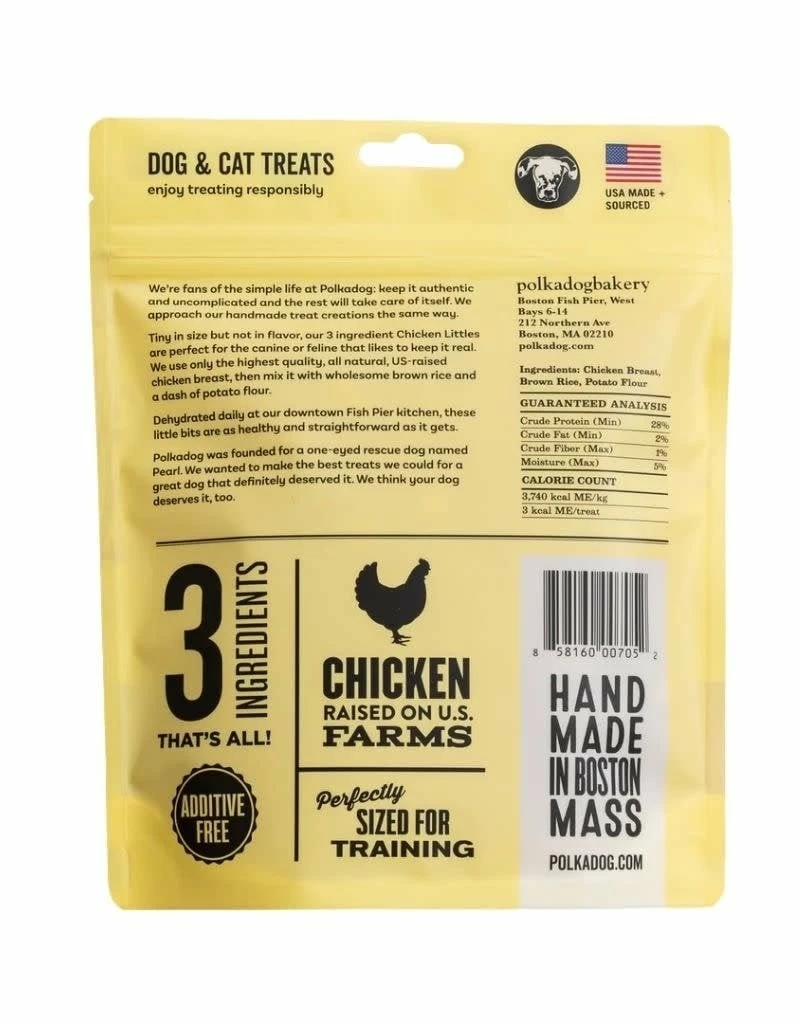Polkadog are fans of the simple life. They approach their handmade treat creations the same way. Tiny in size but not in flavor, our three-ingredient Chicken Littles are perfect for the canine or feline that likes to keep it real. Polkadog uses only the highest quality, all-natural, U.S.-raised chicken breast, then mixes it with wholesome brown rice and a dash of potato flour. Dehydrated daily at their Boston Fish Pier kitchen, these chicken dog treats are as healthy and straightforward as it gets.