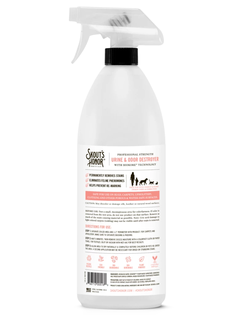 Skouts Honor Cat Urine & Odor Destroyer quickly removes cat urine, vomit, hairball, feces, marking scent, spray stains & odors! Safe for use on rugs, carpets, upholstery, clothing and other porous & water-safe surfaces. Great for eliminating the worst cat spray stains and odors.